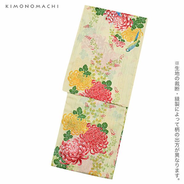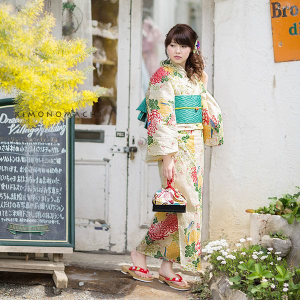 【カラー】浴衣はクリームイエロー地に萩の花と葉、菊の花、オウム模様。帯は青緑色の菱格子模様。
