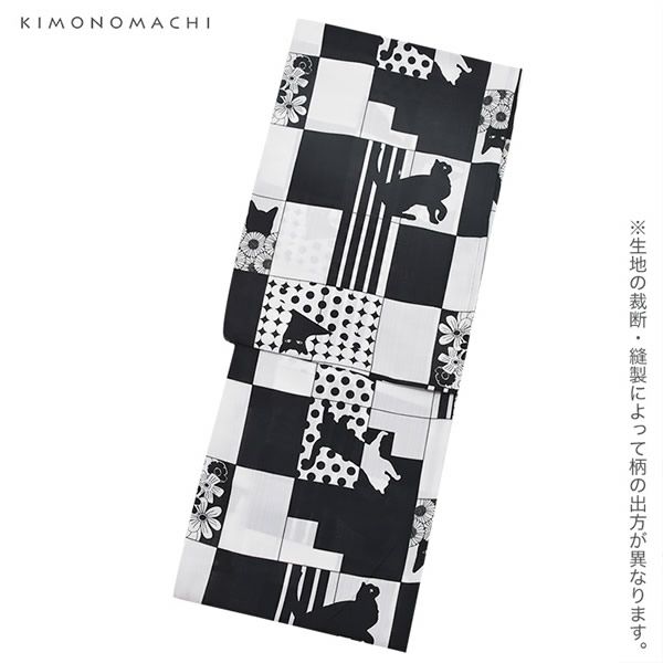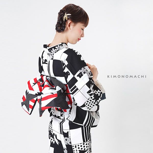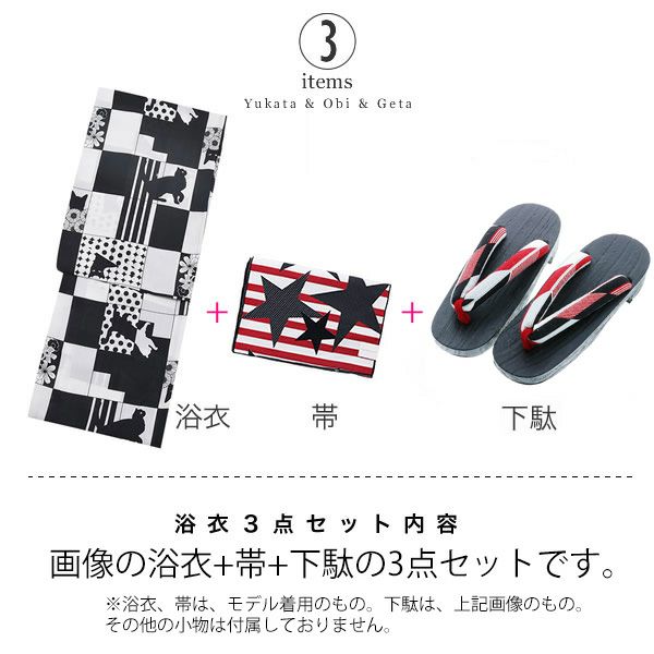 【カラー】浴衣は黒色×白色の大きな格子柄部分のところどころに、水玉とストライプ、レトロ調のお花に、猫のシルエット。帯は赤×白色のストライプに黒色の星模様。
