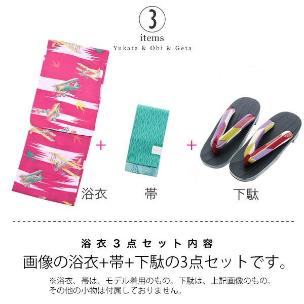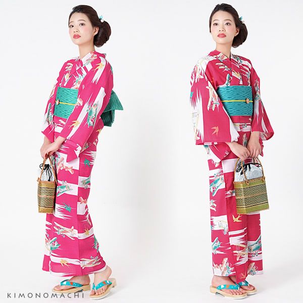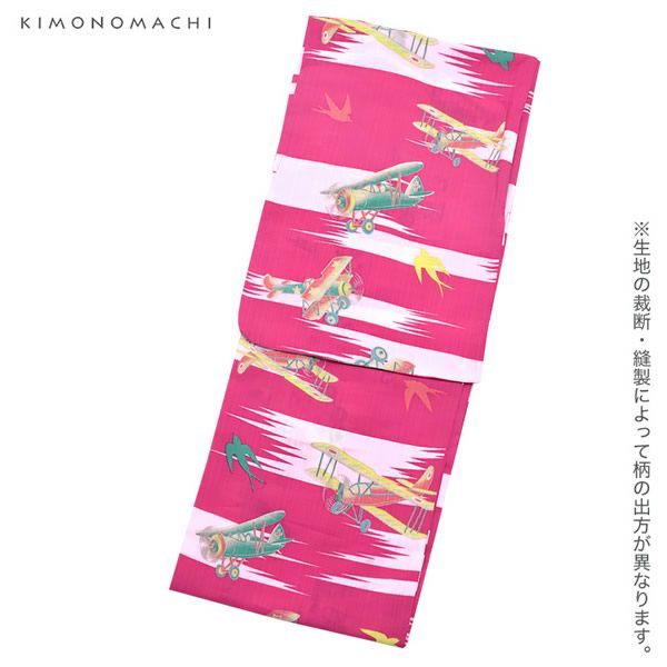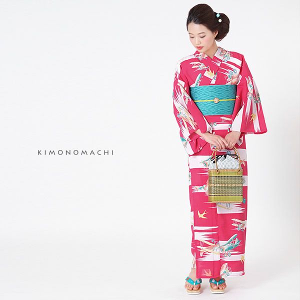 【カラー】浴衣はビビッドなラズベリー色地に、白色のシャープなギザギザ横ライン、レトロな飛行機と、颯爽と舞うツバメ柄。帯は青緑色の菱格子模様。