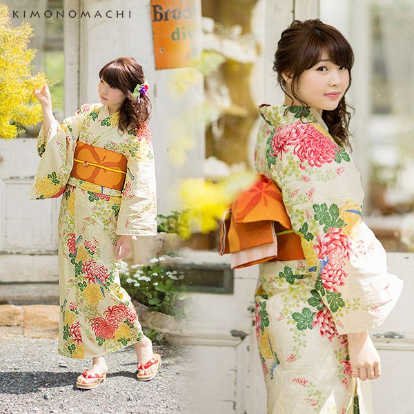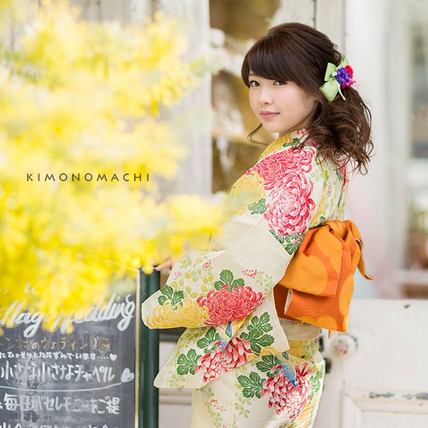 【カラー】浴衣はクリームイエロー地に萩の花と葉、菊の花、オウム模様。帯はレース風の織り模様の入った明るい濃いオレンジ色の色合い。