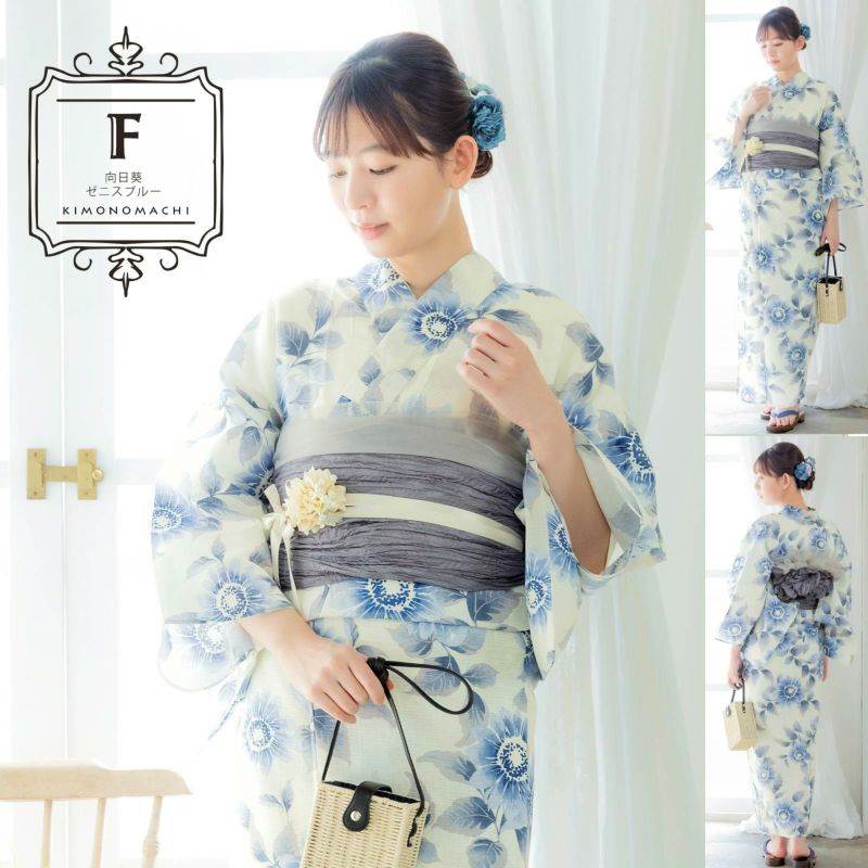 浴衣:アイボリーの地に紺色、グレイッシュな淡いブルー、ブルーグレーで表現されたヒマワリの花。夏の空のような透明感のある青と、輪郭のない水彩調のぼかした表現がさわやかなデザインです。