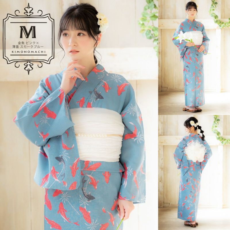 浴衣:落ち着いたグレイッシュな水色の地に、淡いグレーの水草、明るいピンクと薄墨色の金魚の柄。金魚の体の濃淡のぼかしがアクセントとなっています。曲線を描く水草の間を、和金のようなすっきりとしたシルエットの金魚が泳ぐ、金魚鉢を上から見ているかのようなデザインです。スモーキーな地の色と浮き立つような明るいピンクの他にはない色遣いが魅力です。