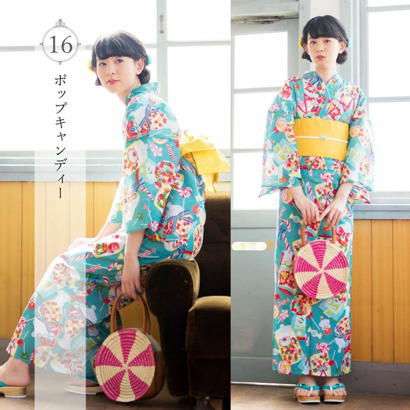 浴衣:青緑色地の上いっぱいに、赤・黄色・ピンク…色とりどりのキャンディーのイラスト。丸い棒付きキャンディーや、瓶いっぱいのキャンディーなど色んな種類のキャンディー重なり合った模様が女の子をハッピーな気分にしてくれます☆