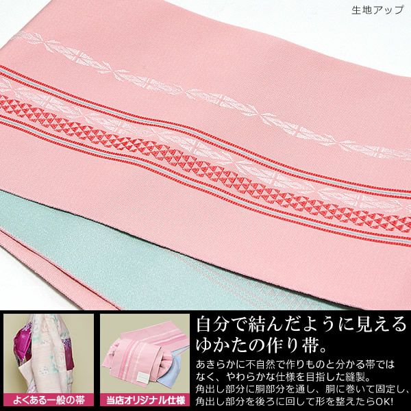 角出し風で、小粋な雰囲気の作り帯です。角出し部分に胴部分を通して、胴にまいて紐を結び、形を整えて、角だし部分を後ろに廻したら完成です。一般的な浴衣の作り帯とは違い、リボン部分に型紙などが入っていませんので、自分で結んだかのような、自然な形になります。(リボン自体には厚紙等入っていません。ですので、自然な形に見えます。)