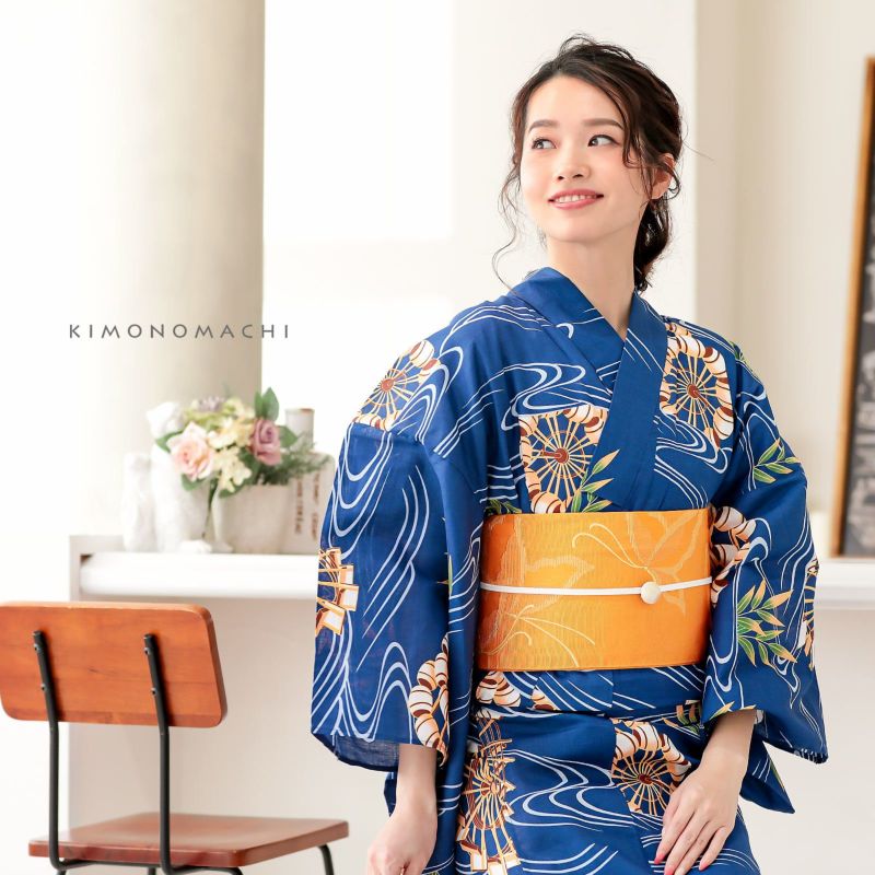 【カラー】濃い青色地に、水色の流水模様。水の流れの合間から、2種の水車と笹の葉が見えるのが涼しげ。水車の部分は白色とオレンジベージュに明るい茶色、ラインとところどころにからし色。笹の葉はオレンジベージュ色、一部に緑色がほんのりと。