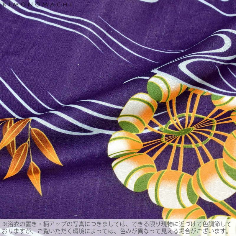 【カラー】青みのある紫色地に、水色の流水模様。水の流れの合間から、2種の水車と笹の葉が見えるのが涼しげ。水車の部分は白色と鶯色に明るいオレンジ色、ラインとところどころに黄土色。笹の葉は明るいオレンジ色に、影のように茶色がほんのりと。