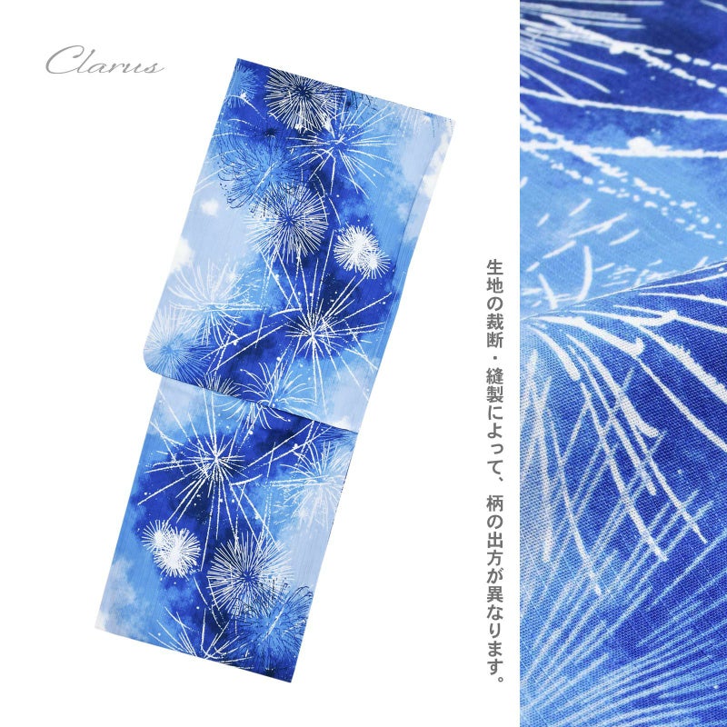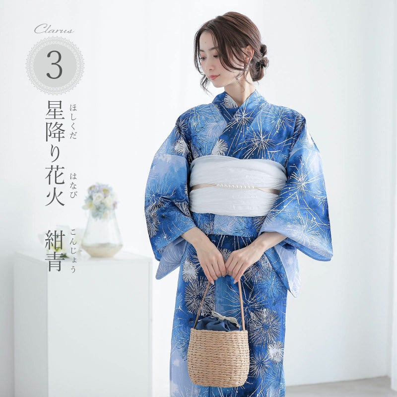 3.星降り花火 紺青:淡い群青色に濃淡のあるネイビーの流れ。白やネイビー、水色の線で表現された花火。夏の夜に次々に打ちあがる花火のスターマインのような鮮烈な雰囲気の浴衣です。