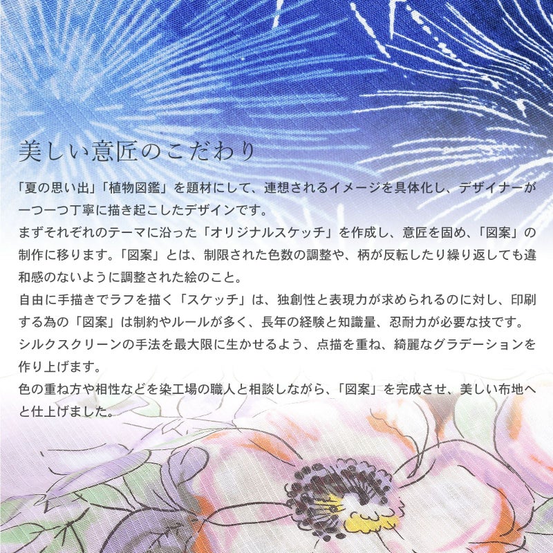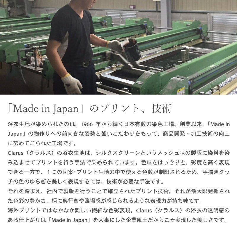 海外プリントではなかなか難しい繊細な色彩表現。Clurus(クラルス)の浴衣の透明感のある仕上がりは「Made in Japan」を大事にした企業風土だからこそ実現した美しさです。