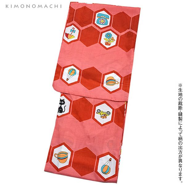 京都きもの町オリジナル 女性浴衣 女性浴衣「赤×コーラルピンク レトロイラスト」LLサイズ 夏祭り、盆踊りに レトロ ポリエステル 女性浴衣 【メール便不可】m1906ykl50ss2506ykl55