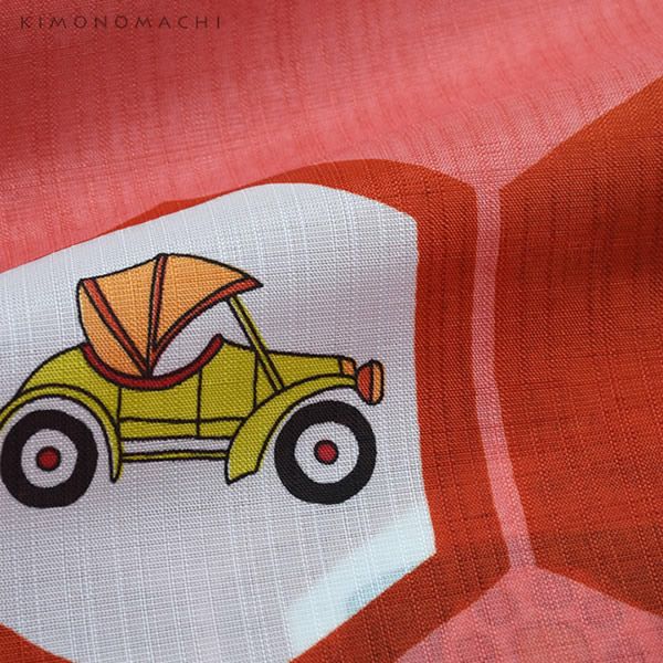 【カラー】コーラルピンク地に赤色の亀甲模様が並んだ、レトロ&モダンなデザイン。気球にコーヒーカップ、猫……ほのぼの素朴なタッチで描かれた昭和テイストのイラストが可愛い!