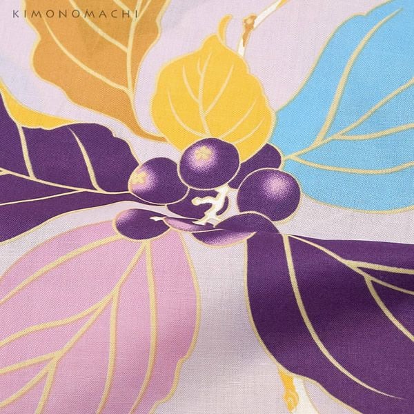 【カラー】浴衣全体に、流れるように配置された葉っぱと木の実柄。淡い紫色地に、優しいラインで描かれた濃い紫とピンク、水色、からし色の柄がフェミニンなムード。