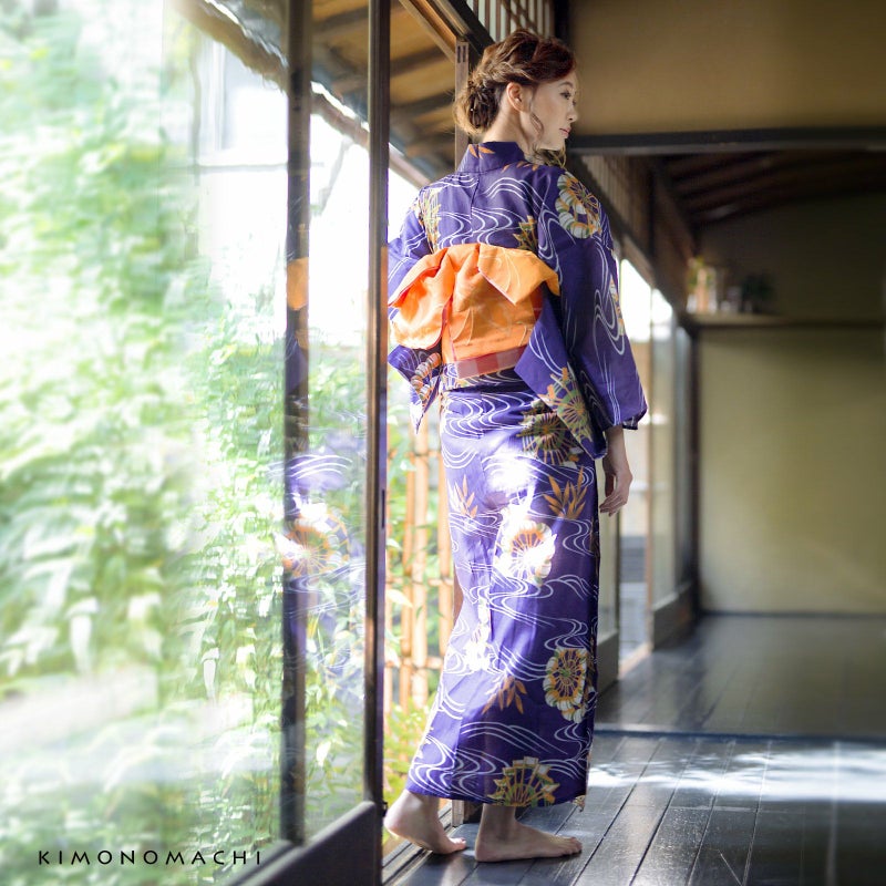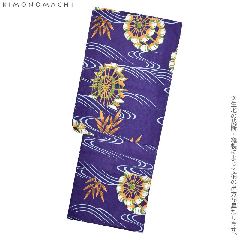 【カラー】青みのある紫色地に、水色の流水模様。水の流れの合間から、2種の水車と笹の葉が見えるのが涼しげ。水車の部分は白色と鶯色に明るいオレンジ色、ラインとところどころに黄土色。笹の葉は明るいオレンジ色に、影のように茶色がほんのりと。