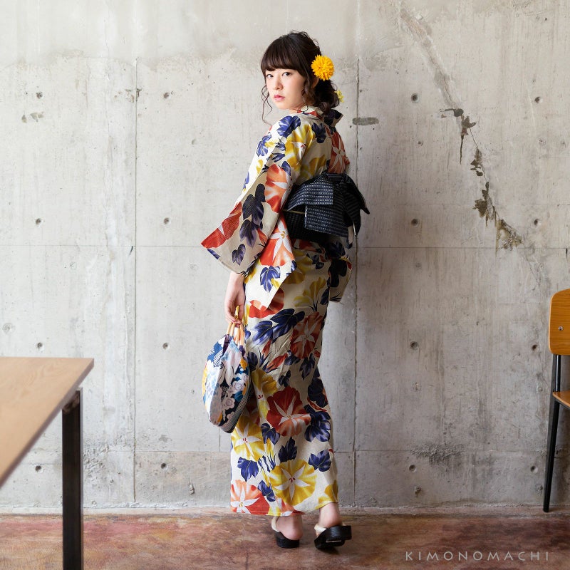 【カラー】生成り地に黄色と朱赤の大きな朝顔。葉は紺。