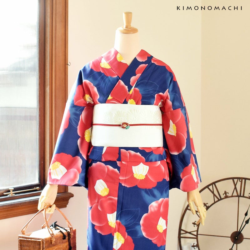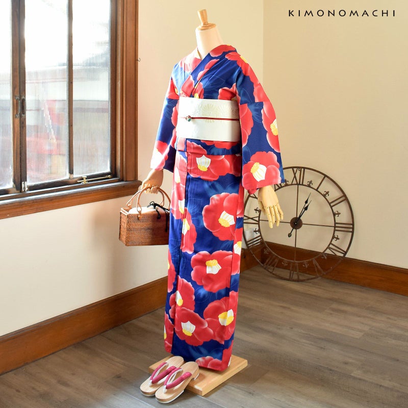 【色柄】やや明るい藍色の地に赤い椿の花、淡くぼかされた水色の葉。はっきりとした色遣いの大きなお花のデザインですが、水彩画のようなぼかしが優しくしっとりとした雰囲気にしてくれます。