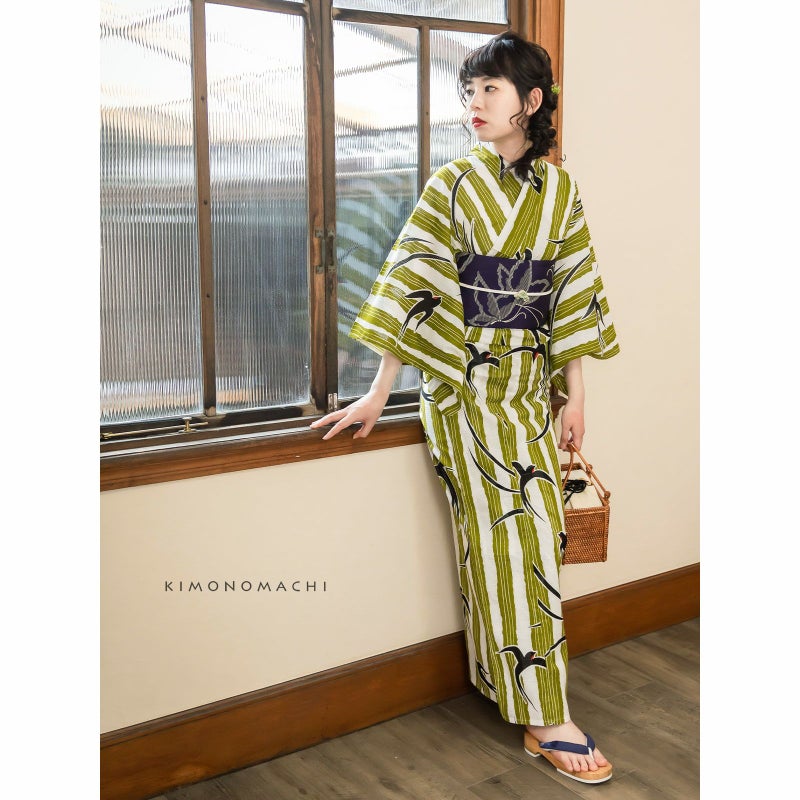 6. 【Prices down2】浴衣 レディース 「縞にツバメ 抹茶緑」 綿絽 大人 個性的 花火大会 夏祭り 女性浴衣 女性ゆかた 浴衣単品 夏着物 きもの町オリジナル KIMONOMACHI 【メール便不可】ss2506ykl10