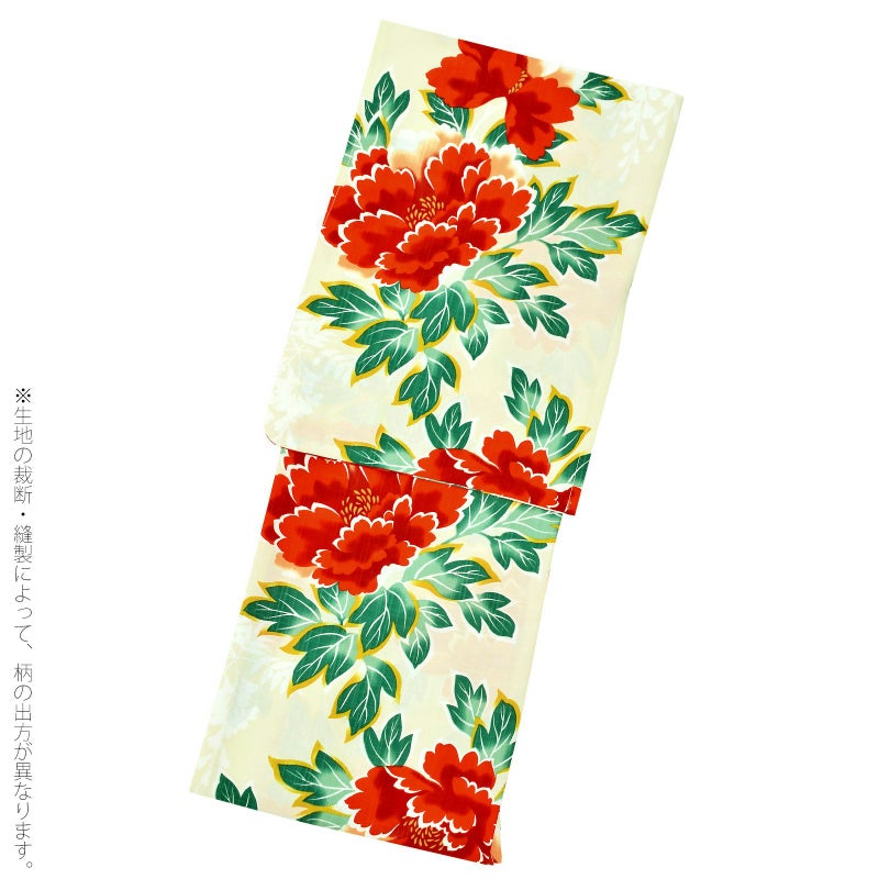 淡いアイボリーの地に、大輪の緋牡丹の柄。あざやかな赤の濃淡や、淡いオレンジの花、緑色の葉。花びらの白、葉の金茶色の輪郭線が、強い印象を添えています。