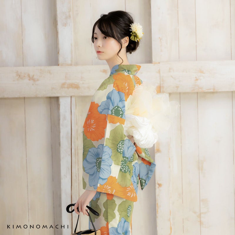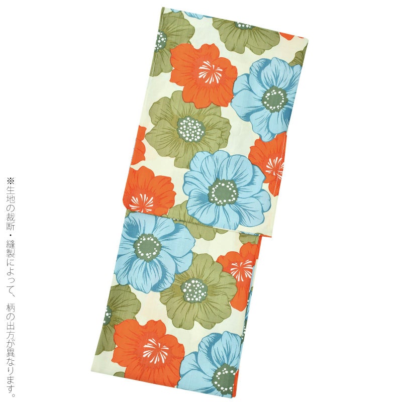 ベージュみの淡い黄緑色の地に、淡いカーキグリーンやスモークブルー、橙色のポピーを散らしたデザインです。落ち着いた色遣いと大きな花々が大人かわいい印象です。