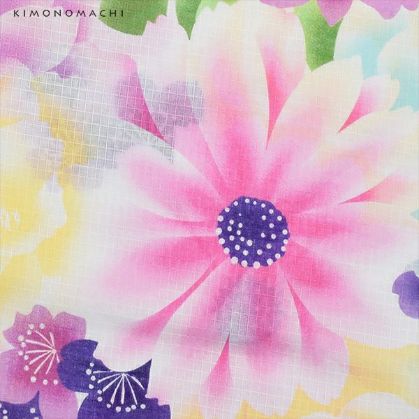 白地の浴衣一面に、ほとんど隙間なく、重なり合うように咲いたラベンダー色・明るい水色・淡いピンク・薄い黄色・紺色のお花模様が華やか。ラブリーな夏のワンピースを思わせる一枚。