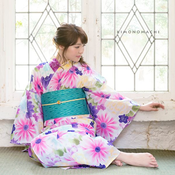 赤みのある紫色の帯を合わせてみると、花柄でも甘くなりすぎず、ちょっと大人っぽく着こなせます。鮮やかターコイズブルーの帯を合わせてカラフルな着こなしを楽しんでみるのもオススメ!