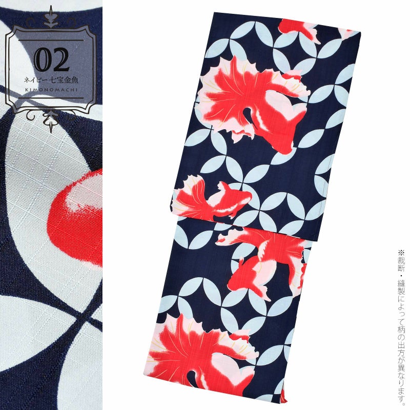 02ネイビー 七宝金魚…深い紺地にごく淡い水色の七宝繋ぎの柄、その上を大小の紅色の金魚が泳いでいます。紅色に薄桃色の大きなヒレを広げた金魚が華やかな印象です。