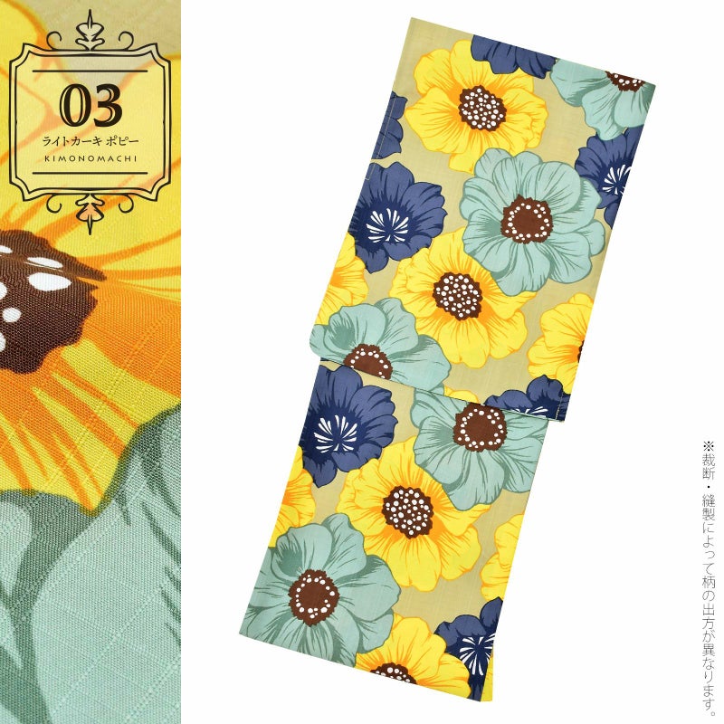 03ライトカーキ ポピー…ややグレイッシュな黄緑色の地に、明るい黄色や青磁色、浅いダークブルーのポピーを散らしたデザインです。落ち着いた色遣いと大きな花々が大人かわいい印象です。