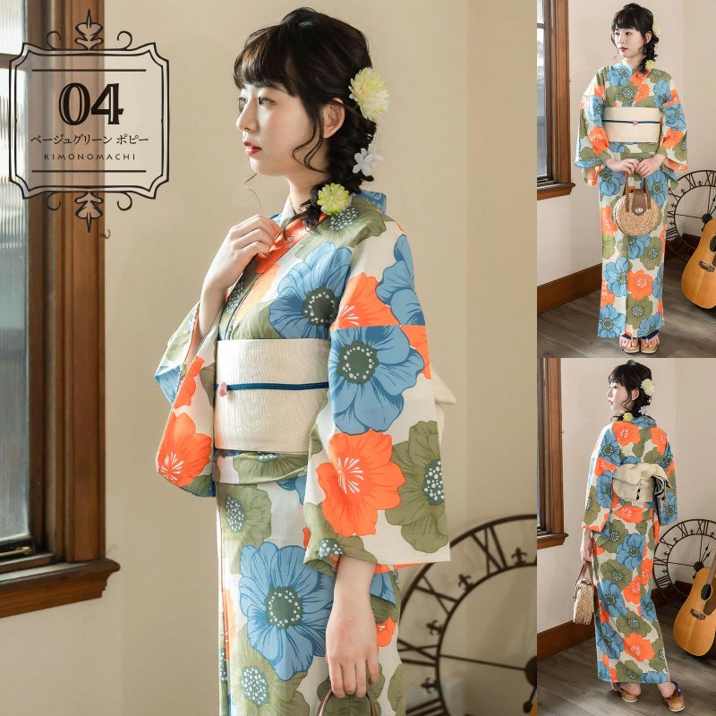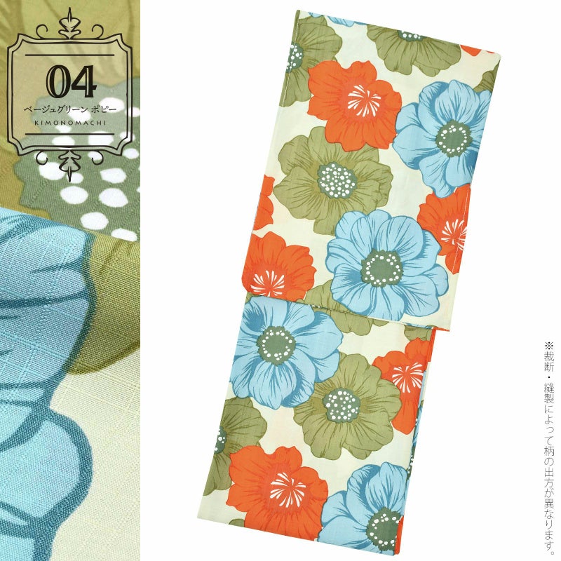 04ベージュグリーン ポピー…ベージュみの淡い黄緑色の地に、淡いカーキグリーンやスモークブルー、橙色のポピーを散らしたデザインです。落ち着いた色遣いと大きな花々が大人かわいい印象です。