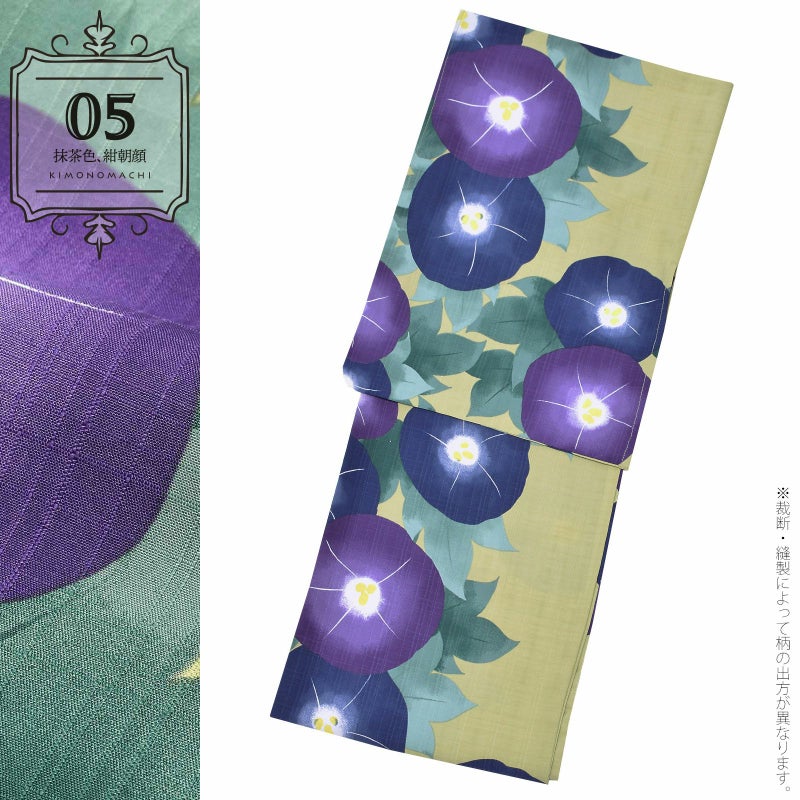 05抹茶色、紺朝顔…灰みの薄黄緑色の地に、大輪の朝顔が縦の流れに配置されたデザイン。濃淡のある紺青や紫色に白い曜の入ったお花はしっとりとみずみずしく、錆びた青磁色や青鈍色の葉が奥行きを生み出しています。
