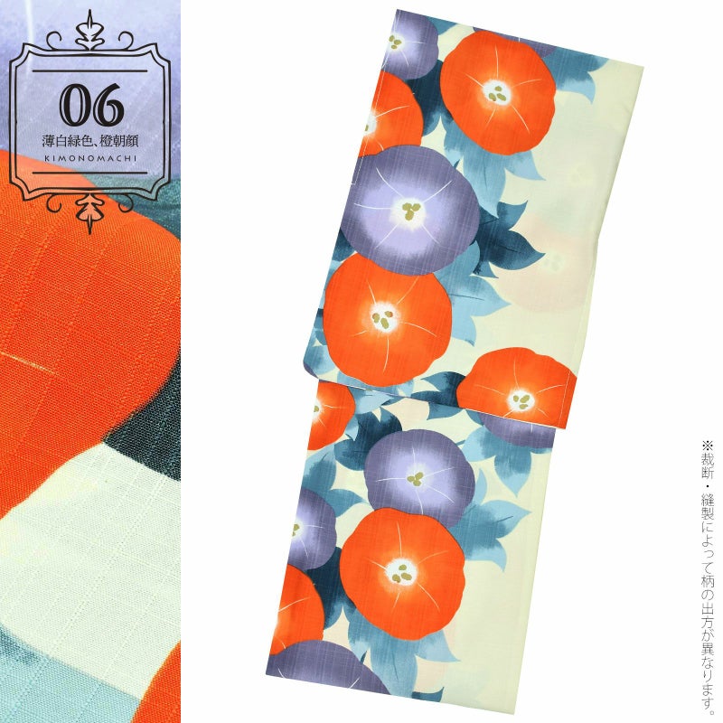 06薄白緑色、橙朝顔…淡い浅黄緑色の地に、大輪の朝顔が縦の流れに配置されたデザイン。濃淡のある橙色や江戸紫色に白い曜の入ったお花はくっきりとしながらも深みがあり、浅縹色や浅葱色の葉が奥行きを生み出しています。