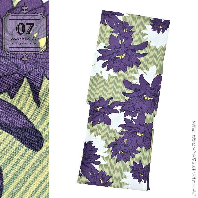 07モスストライプ、ダリア…ややグレイッシュな薄黄緑にモスグリーンの乱調のストライプの地、大きなダリアの花を散らしたデザイン。くっきりとした深紫のお花に、黄色の蕊がポイントです。白抜きのシルエットが奥行きのある印象に。