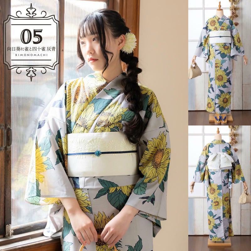 やや青みの灰色の地。濃い青緑色の線で描かれた花鳥画風のヒマワリにスズメやシジュウカラ。浅い山吹色の花芯に明るい灰みの黄色の花びら、浅い青緑色や青磁色の葉。同色の羽根に浅い山吹色が印象的な雀が花に溶け込むように飛び寄っています。夏の日にも涼し気な色調がモダンな浴衣です。