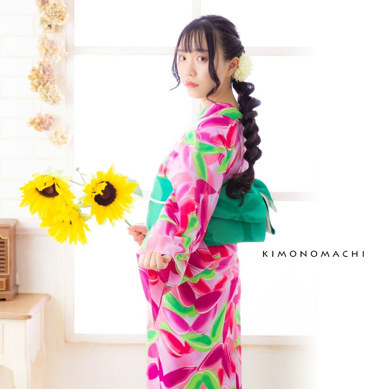 肌の色を明るく見せてくれる、キレイ色の浴衣。薄いピンク地に舞う、紫にマゼンタ、そして青葉を思わせる鮮やかな黄緑色の蝶々がデザインされていてキュート! ビビッドカラーの帯と相性バツグンです。