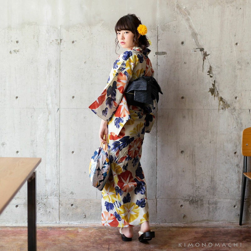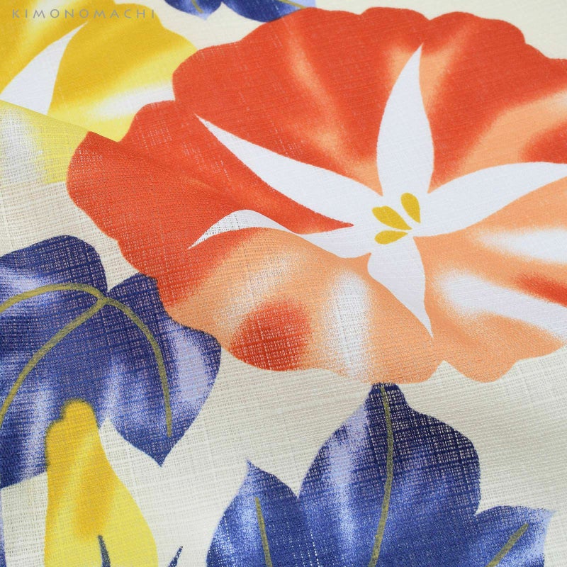 【色柄】生成り地に黄色と朱赤の大きな朝顔。葉は紺。