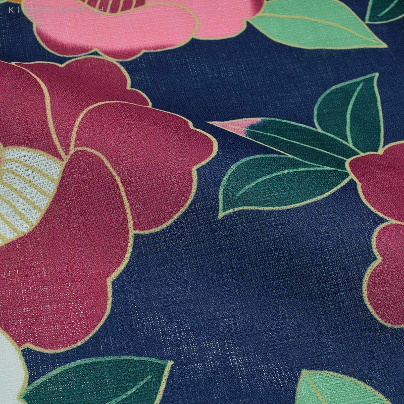 【色柄】ネイビー地に紫・ピンク・白のレトロタッチの椿