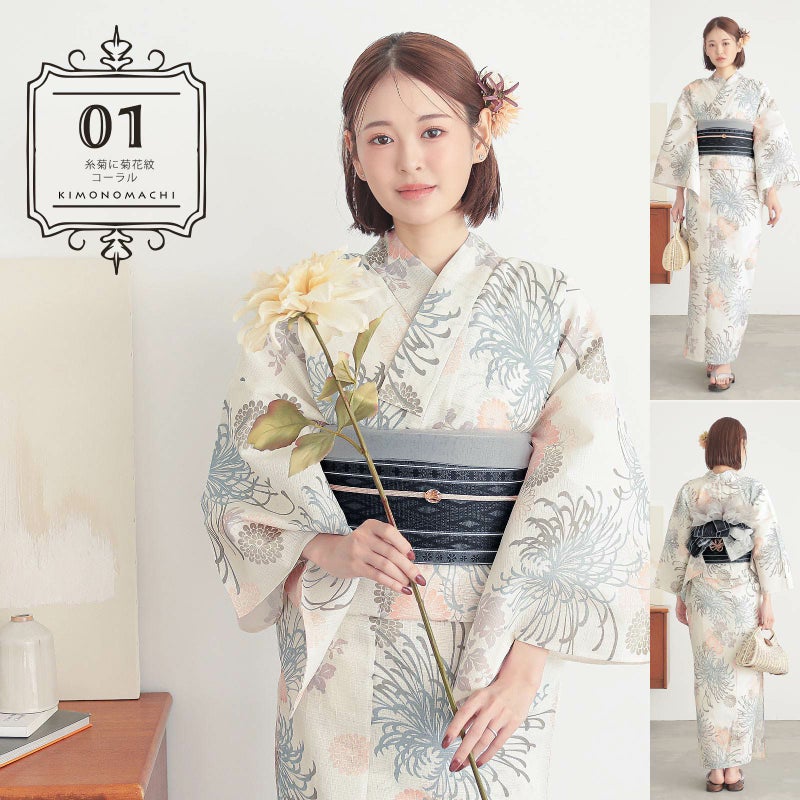 アイボリーの地に、グレーと抹茶色のぼかしの入った大きな糸菊の花。コーラルピンクや抹茶色、淡い桃色の菊の花紋にウォームグレーの葉。糸菊の繊細な華やかさと優しい配色が落ち着いたかわいらしい雰囲気です。