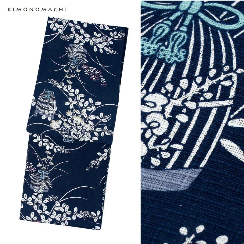 青藍の地に白抜きで表現された萩や桔梗、撫子、芝草の秋草文様に浅い黄土色や深い赤みの紫の挿し色。白に青灰色、浅い水色の紐を添えた虫かごが物語を感じさせます。