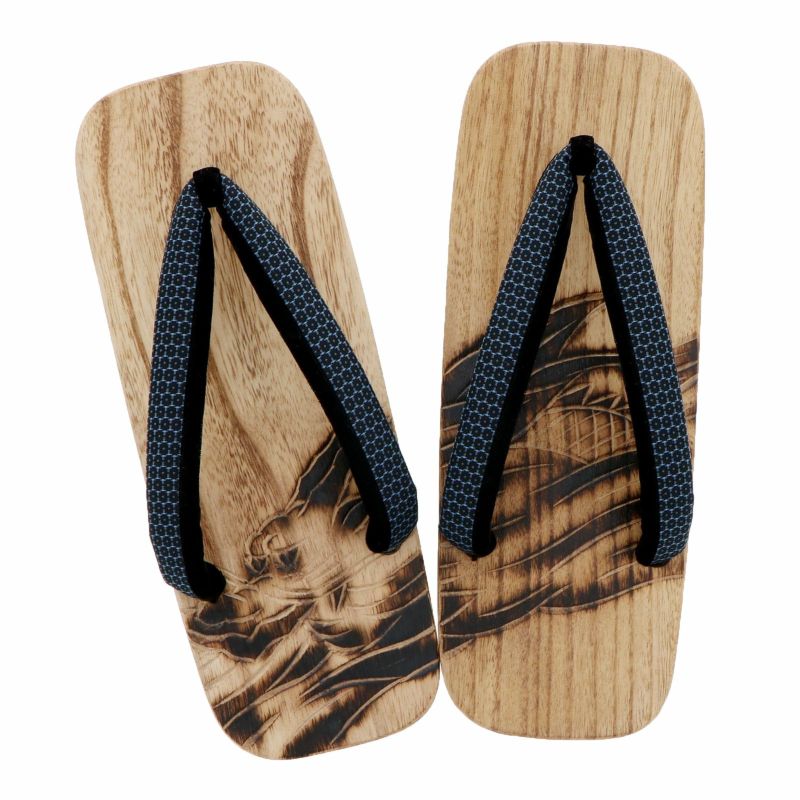 【色柄】白木の木彫の台、焼き加工を施した龍。左右で一繋がりになる柄です。鼻緒は黒と藍色の細かな亀甲絣。裏地、前坪は黒。