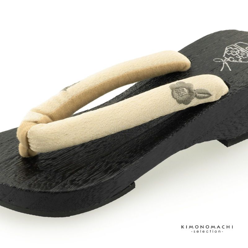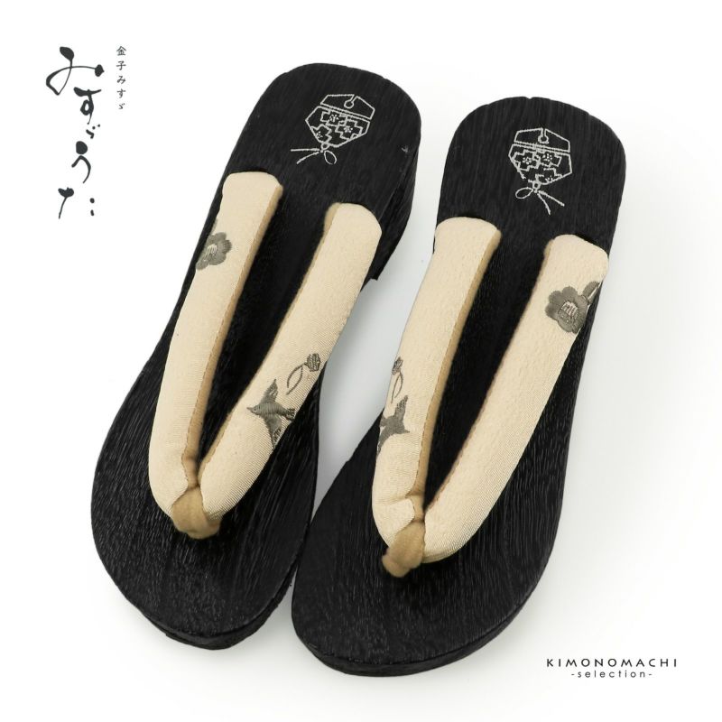 【色柄】足形に添ったカーブのあるヒールタイプの台。台の色は黒色、かかとに鈴の絵。鼻緒はベージュ地にグレーの小鳥と鈴、ツバキの花の刺繍。鼻緒の裏地と前坪はグレージュ。
