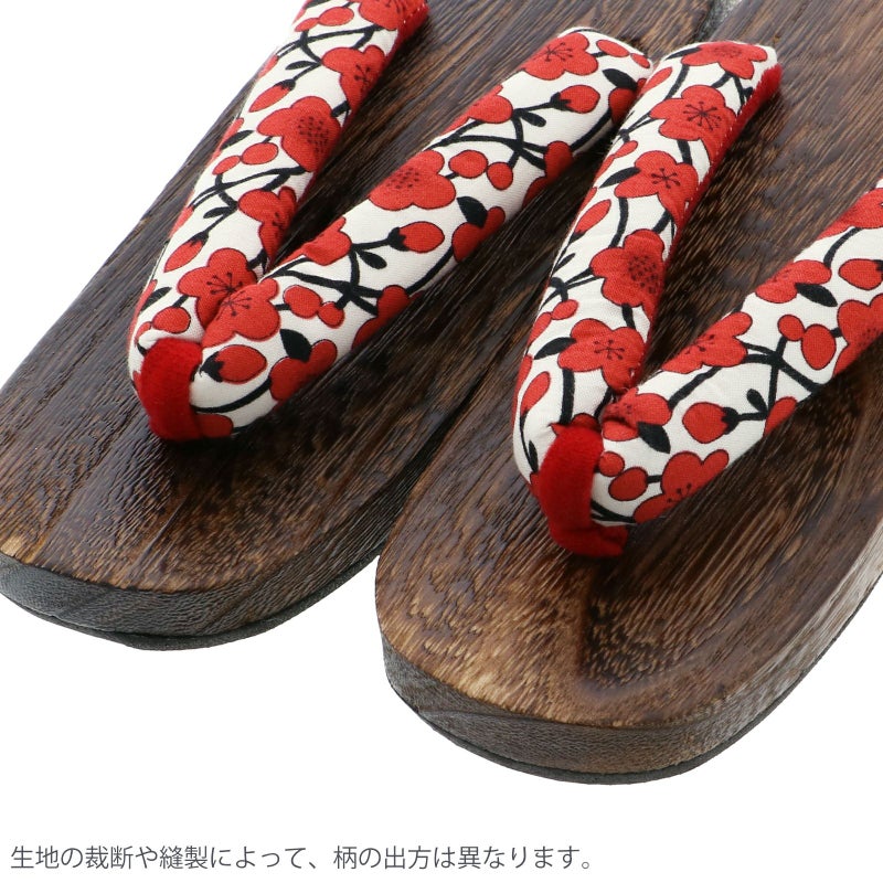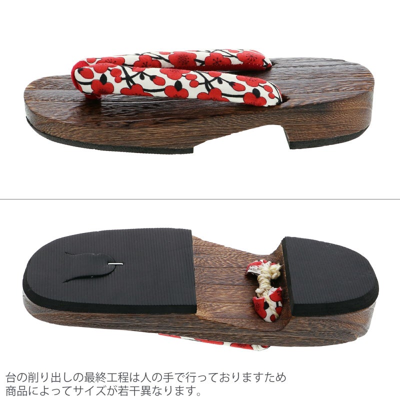 【カラー】鼻緒は白地に赤の梅。前坪は赤。台は焼桐の焦げ茶。