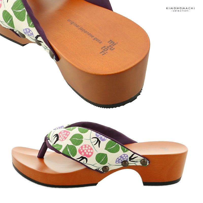 足形に添ったカーブのあるヒールタイプの台。台の色は赤みのある自然な茶色。幅広の鼻緒は、綿シャンタン生地に竹久夢二デザインのどくだみの。オフホワイトの地にピンク、藤色、緑のいちごの柄。裏地は深紫色。前坪は深紫色