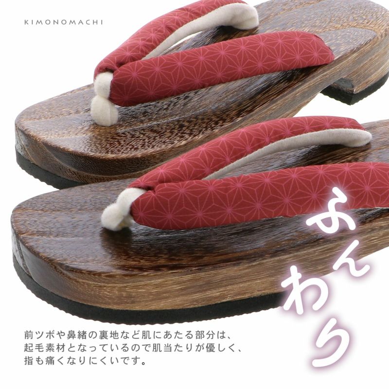 【色柄】鼻緒は赤の地に麻の葉模様、鼻をの裏は白。前坪は白。台は焼桐の焦げ茶色。
