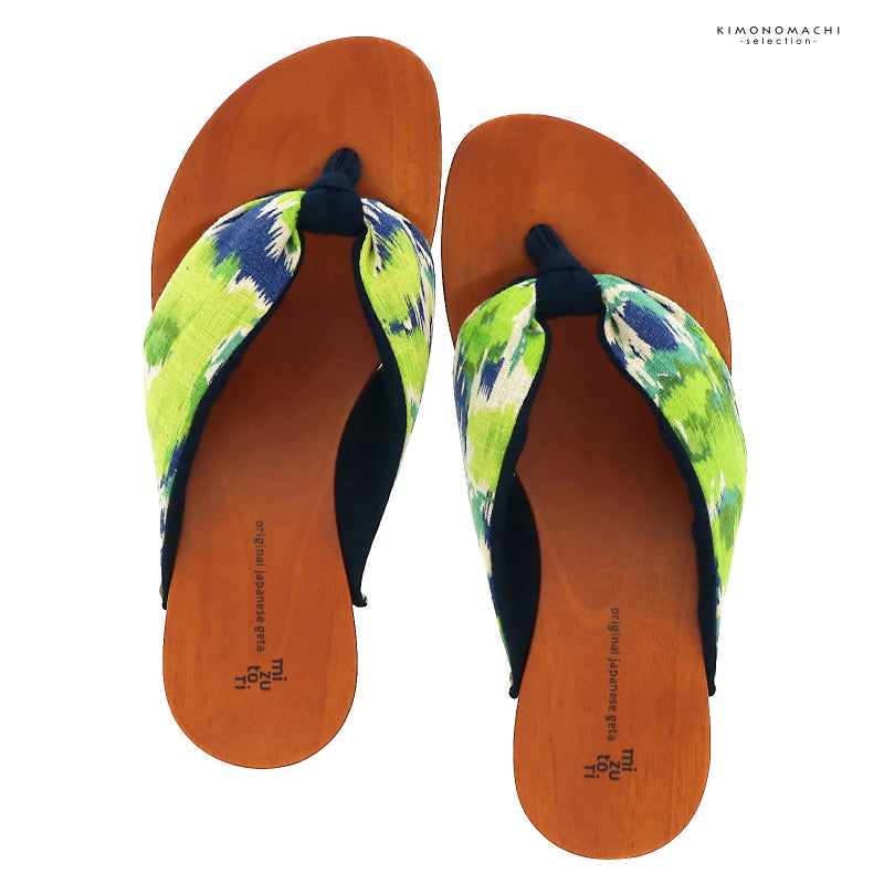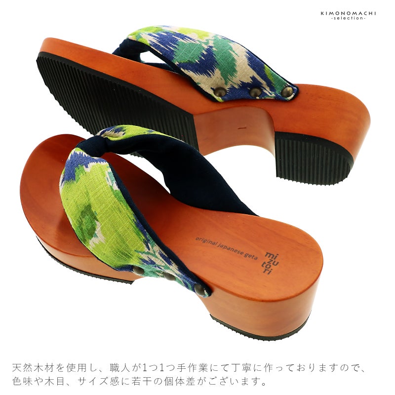 【色柄】足形に添ったカーブのあるヒールタイプの台。台の色は赤みのある自然な茶色。生成り色の地に群青色、黄緑、ターコイズの絣調の模様。裏地は濃紺。前坪も濃紺。