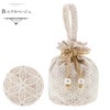 A.ホワイト…ベージュの裏地に白のフラワーレースを重ねた巾着。紐はベージュ。紐先に白のパール調のビーズ。