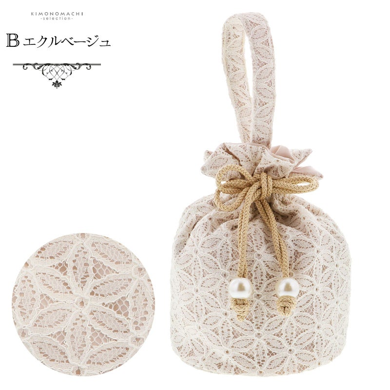 B.エクルベージュ…ベージュの裏地にアイボリーのフラワーレースを重ねた巾着。紐はベージュ。紐先に白のパール調のビーズ。
