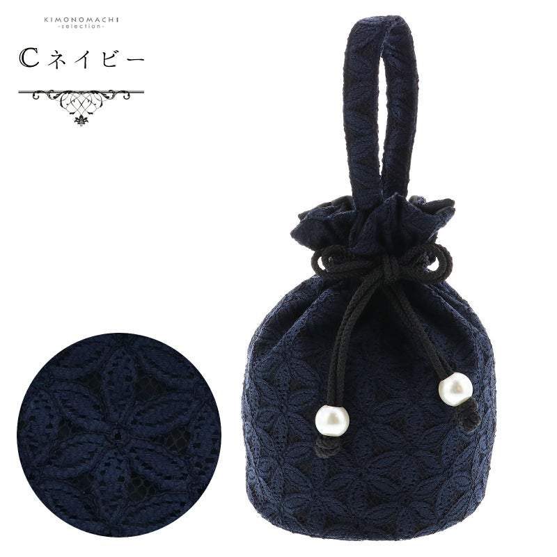 C.ネイビー…黒の裏地に紺のフラワーレースを重ねた巾着。紐は黒。紐先に白のパール調のビーズ。