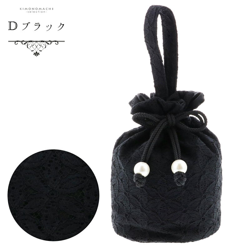 D.ブラック…黒の裏地に黒のフラワーレースを重ねた巾着。紐は黒。紐先に白のパール調のビーズ。