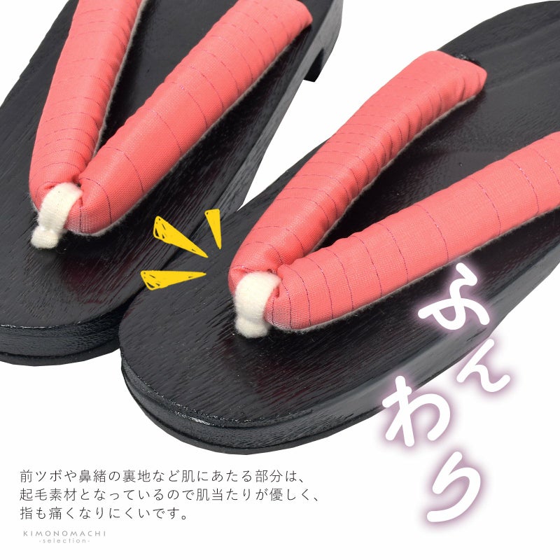 台は焼桐を黒塗りしていて、汚れにくく、鼻緒は裏地がふわふわですので、擦れて痛くなりにくい下駄です。