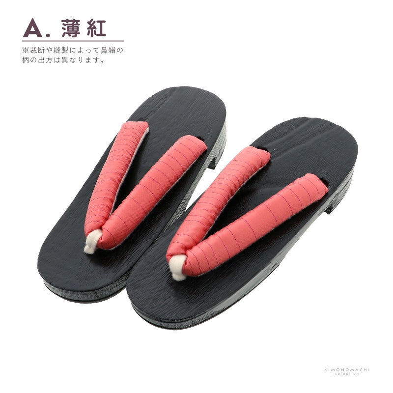 A.薄紅…鼻緒はやわらかい薄赤にランダムなラメの縞。前坪は白。台は黒。