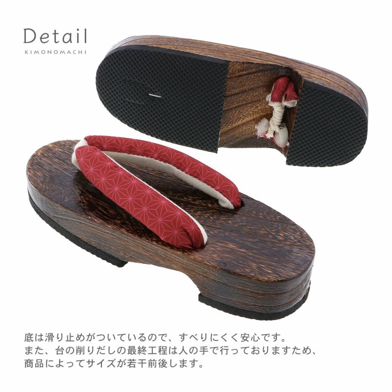 【色柄】鼻緒は赤の地に麻の葉模様、鼻をの裏は白。前坪は白。台は焼桐の焦げ茶色。