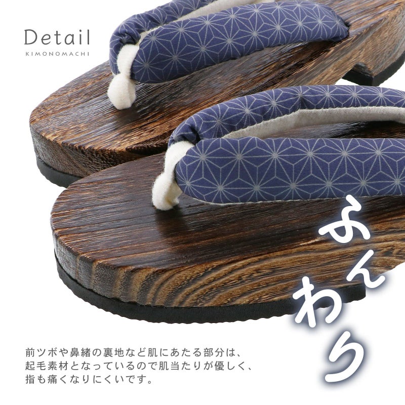 ふっくらとした鼻緒は肌触りが優しく、擦れても、痛くなりにくいところが嬉しいポイントです。台は、軽くて歩きやすい桐を使用。