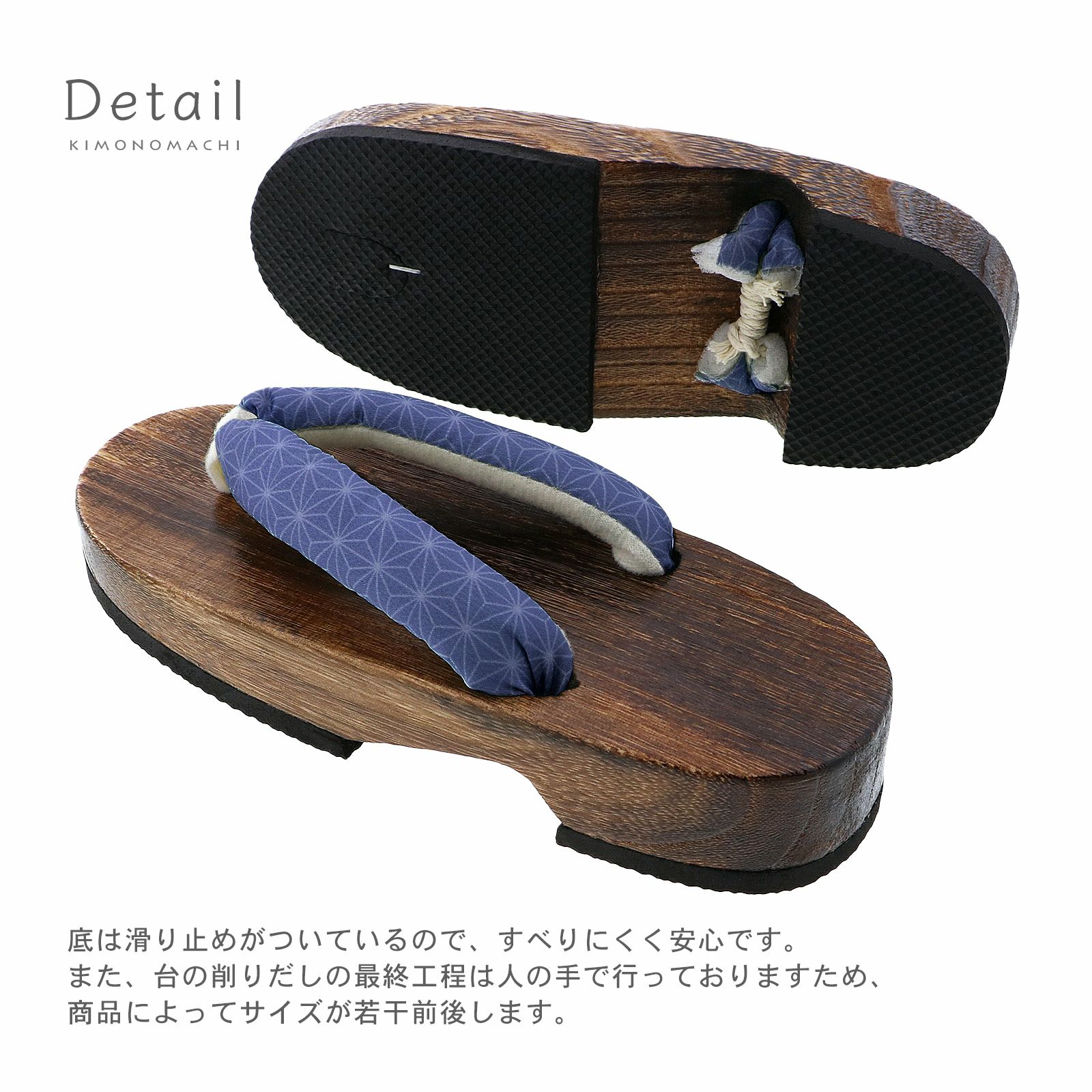 【色柄】鼻緒は紺色の地に麻の葉模様、鼻をの裏は白。前坪は白。台は焼桐の焦げ茶色。